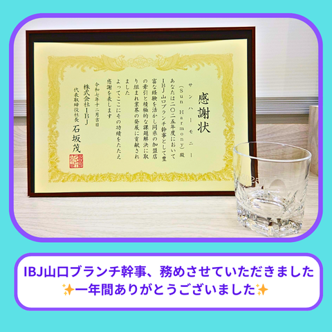 先日IBJより、山口ブランチ幹事の「感謝状」と記念品が届きました。