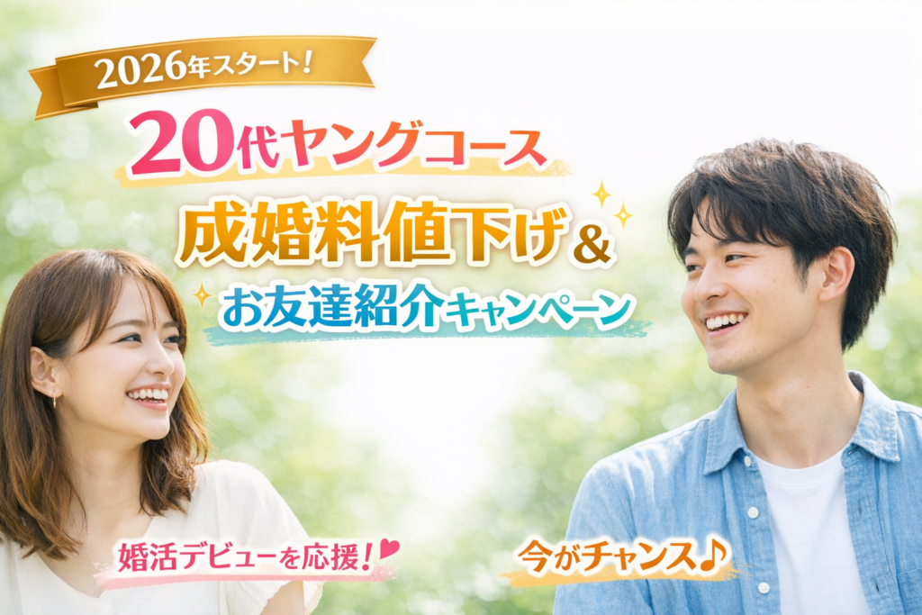 【2026年スタート】20代ヤングコース成婚料値下げ&お友達紹介キャンペーンのお知らせ✨